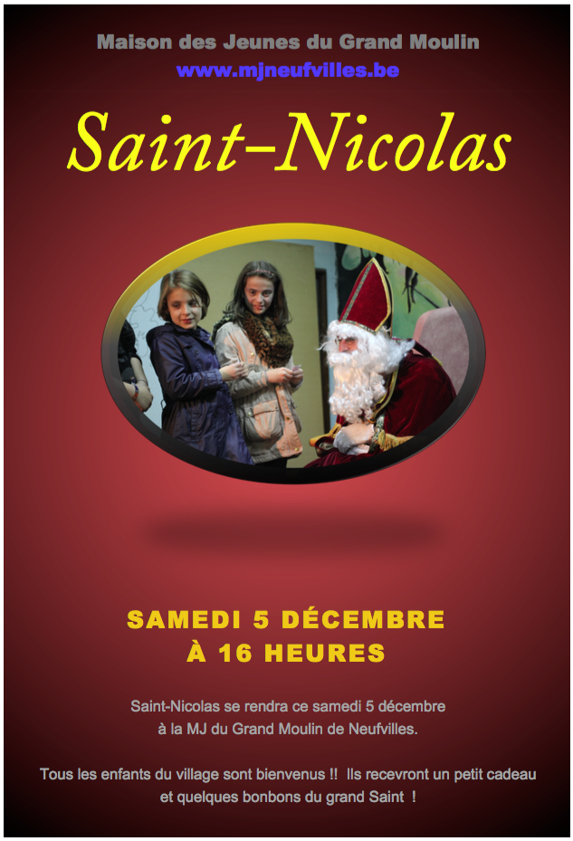 Comme chaque année le grand Saint viendra nous rendre une visite à la MJ. RDV à 16 heures au 54 rue Centrale à 7063 Neufvilles ! 🙂