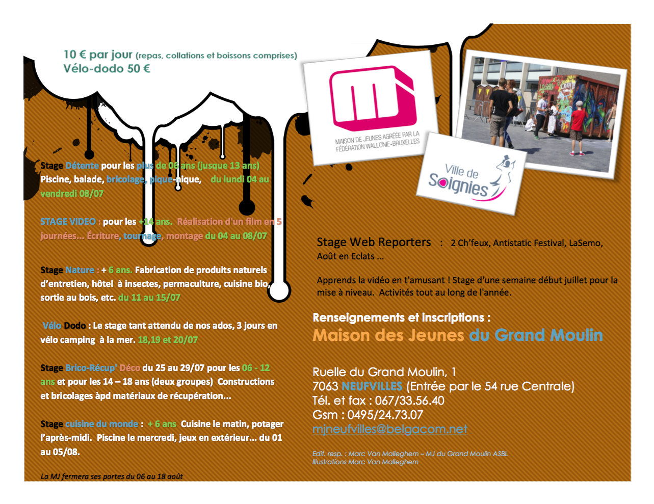 Sans compter les sorties avec les « grands » et nos participations aux festivals du coin. Nous serons particulièrement actifs au 2 Ch’Feux, le 20/08, dont nous sommes partenaires ET à Août en Eclats, l’incontournable multi-festival Sonégien le 27/08. Pour ce dernier nos WEB REPORTERS bénéficieront d’une caravane sise à côté du stand de la MJ de Soignies et en face du bar d’Alter Ego 🙂