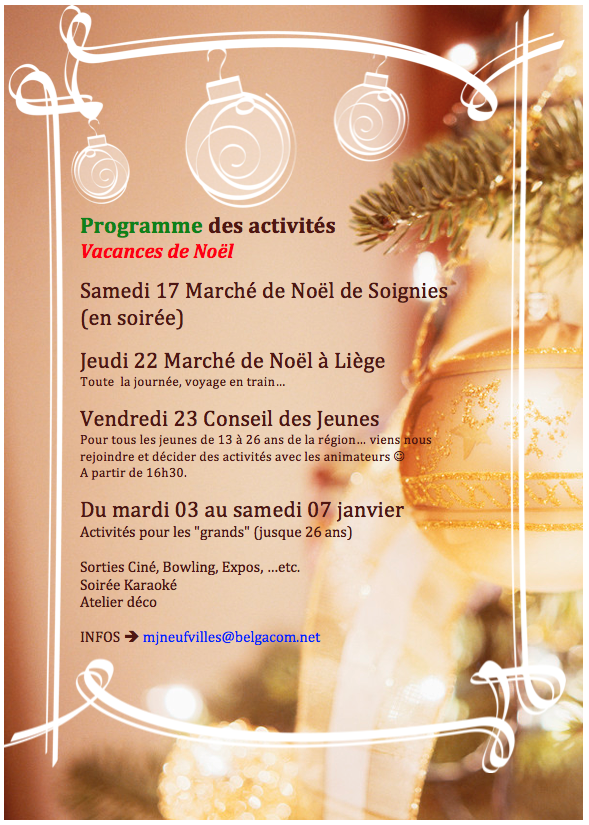 Après une très chouette fête de Saint Nicolas, voici le programme des activités de fin d’année pour les plus grands.