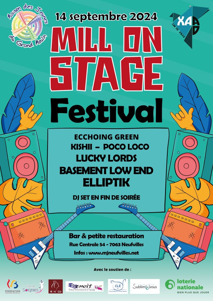 Pour ce qui est de la rentrée on se retrouvera dans diverses activités. La reprise des ateliers début septembre (voir la page des ateliers sur ce site). Notre mini Festival MILL ON STAGE (voir la page concert), mais aussi : le salon du temps libre avec la ville de Soignies au Parc Pater le dimanche 08 septembre, la journée PALM (passe à la maison) le 28 septembre… Bref, on ne va pas chômer.