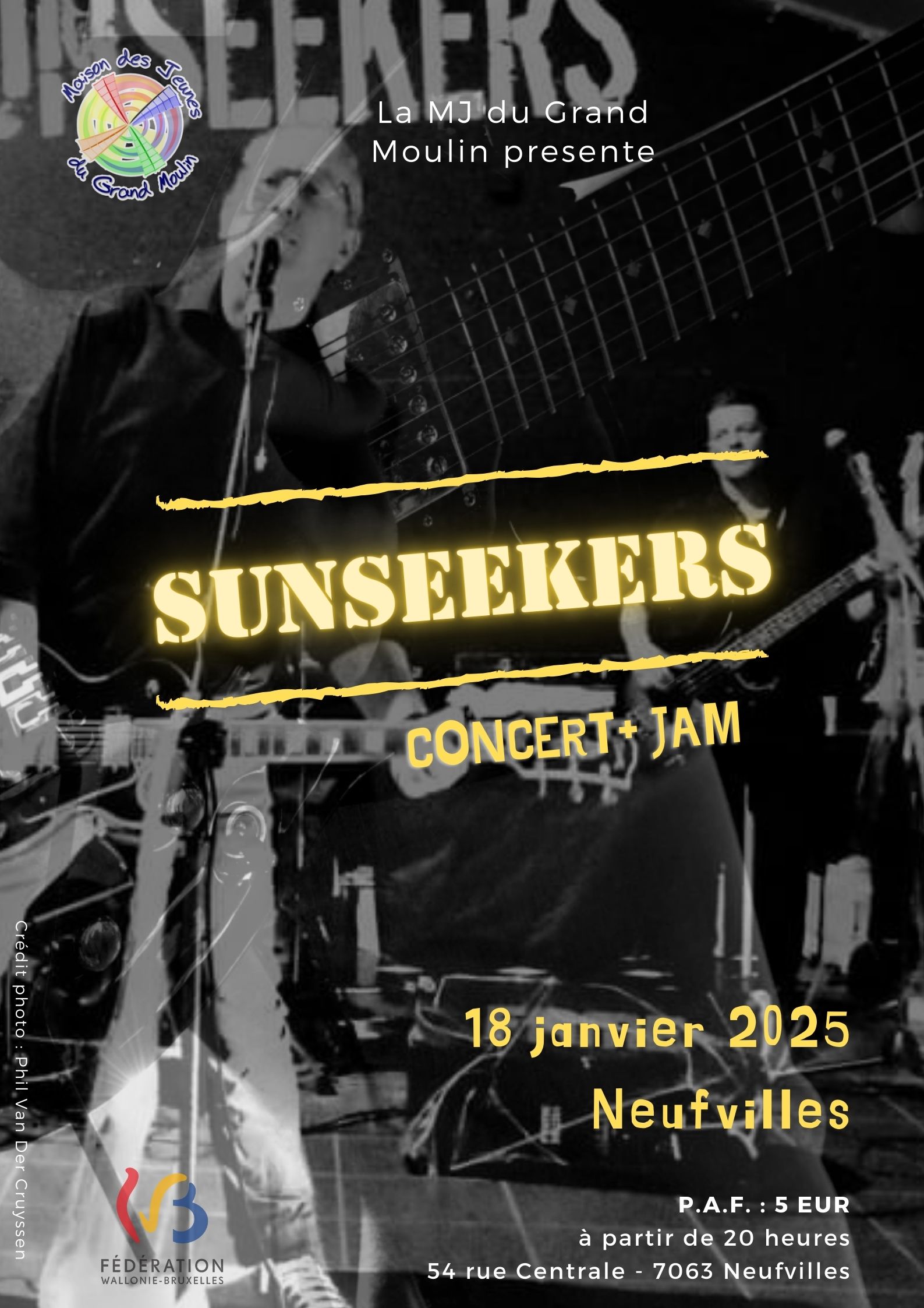 On commence 2025 en beauté avec le retour des SUNSEEKERS, un petit concert du groupe de Soignies qui répète chez nous… en préparation pour leur prochain studio, le concert sera enregistré en live ! La prestation sera suivie d’une JAM à l’ancienne avec le début de quelques élèves de la MJ. Ca va être chouette 🙂