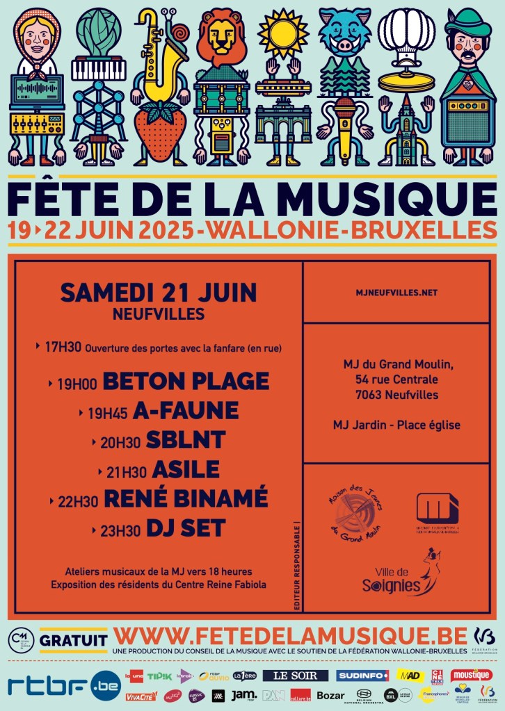 - 22 juin : Fêtes de la musique avec We Are Monroe, Super Hérisson, … DJ TL (Thomas Laurent) de la MJ de Neufvilles